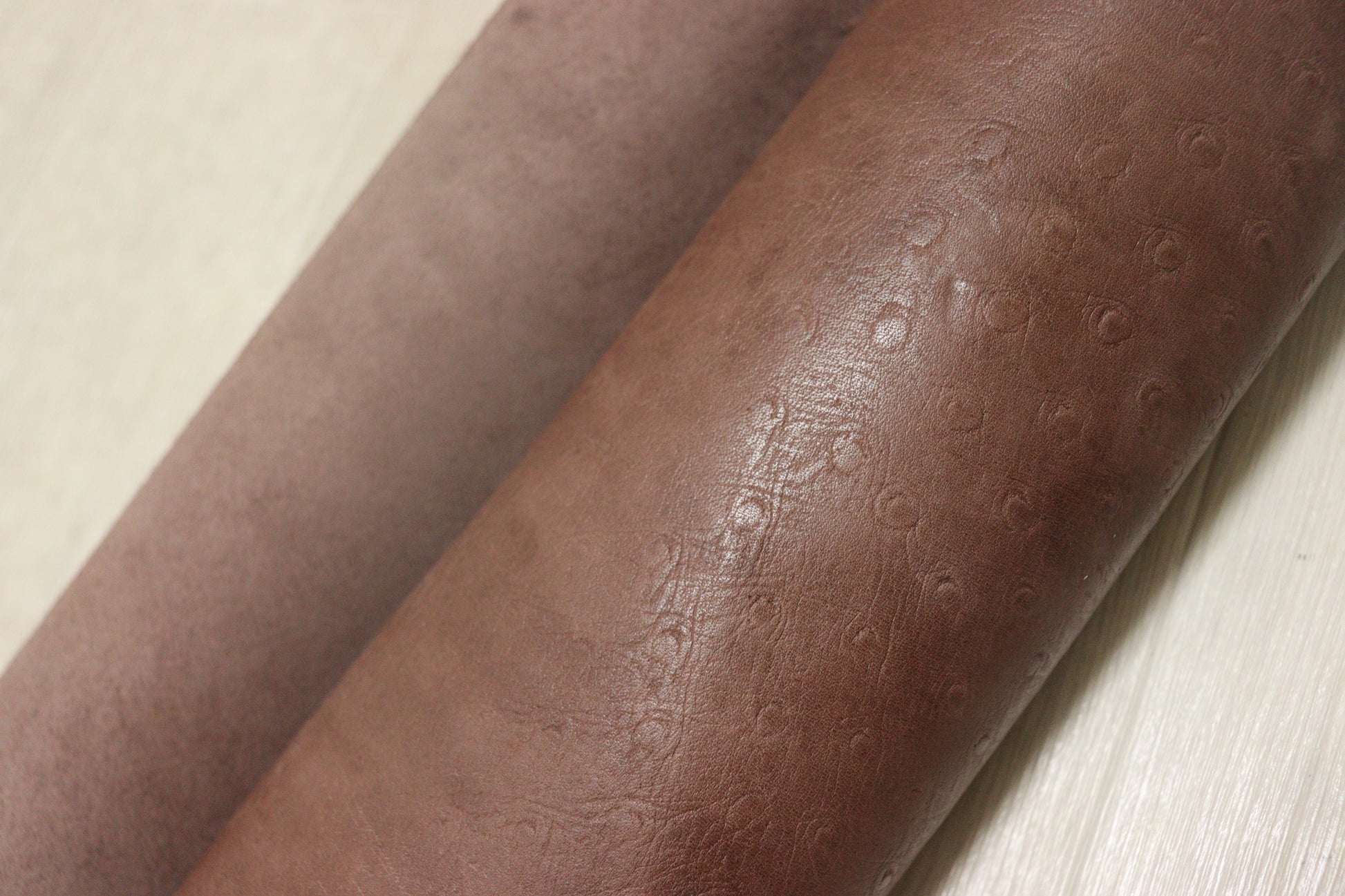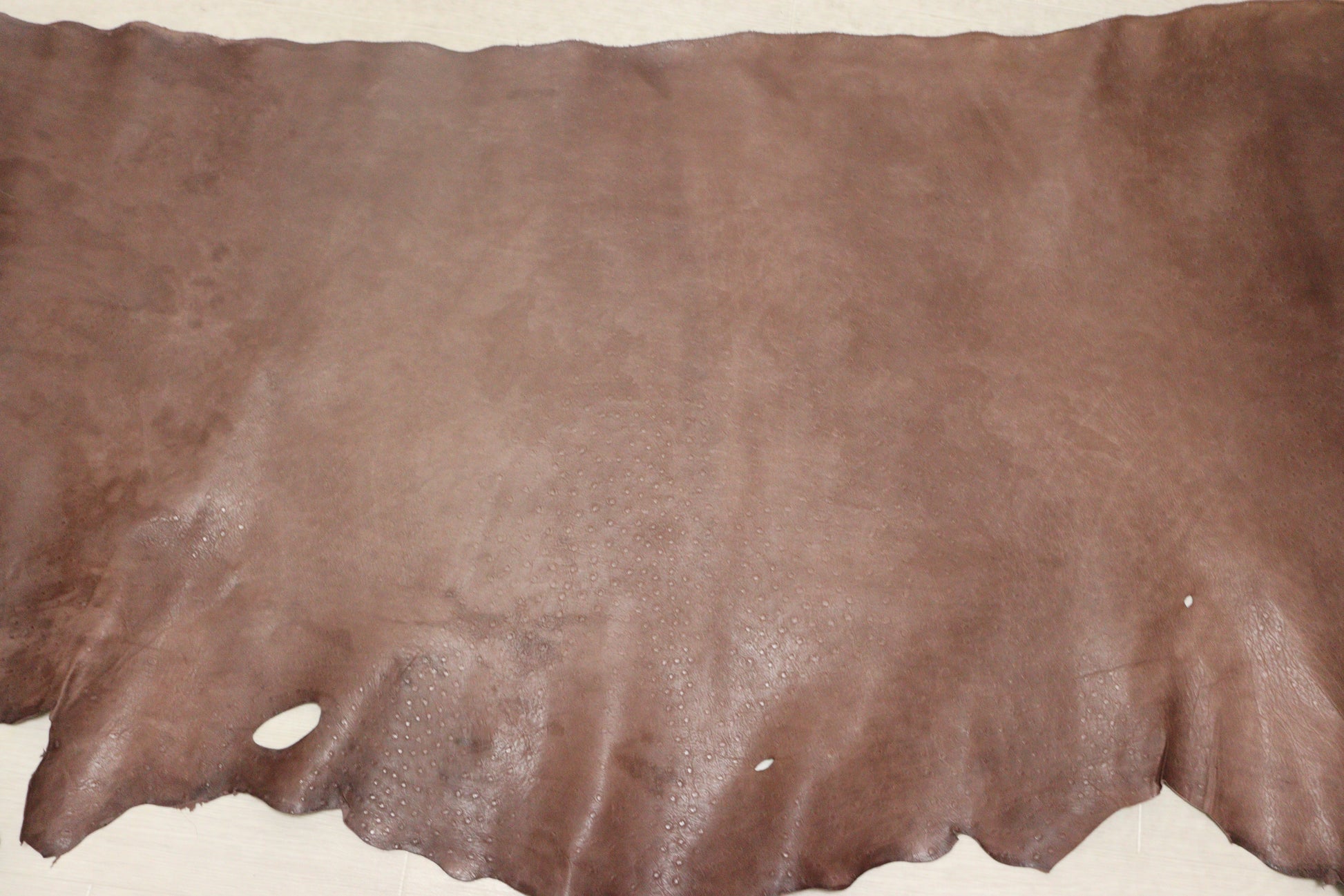 素材の表情を活かした染料仕上げにエキゾチックなオーストが型押しされたエンボス加工